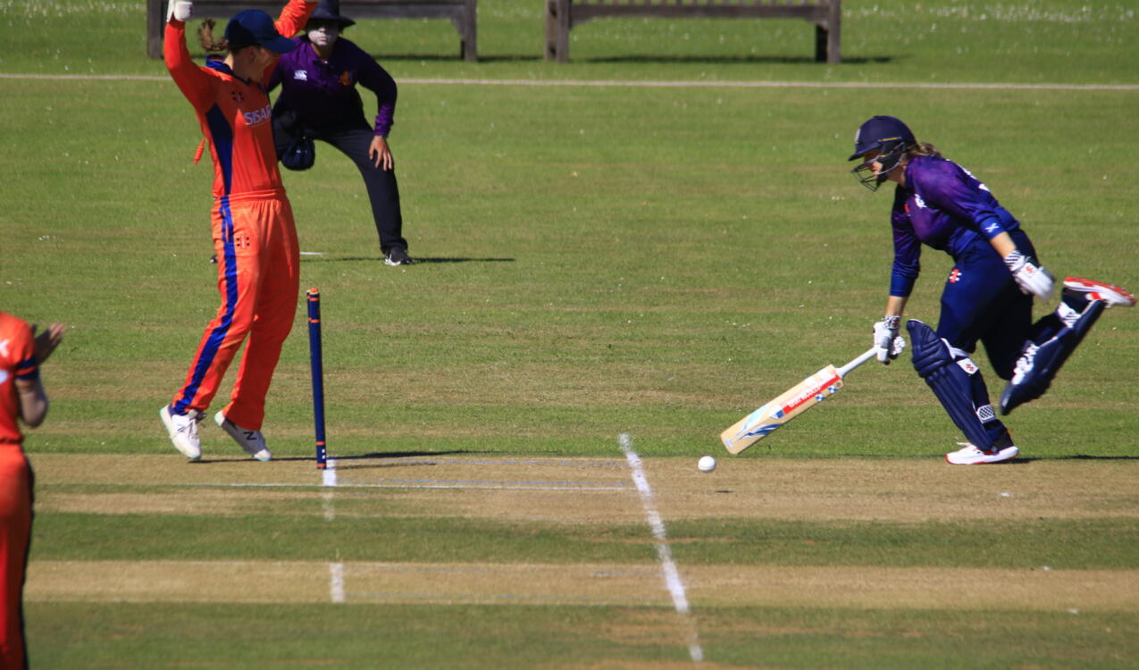 Frédérique Overdijk (a well-made 34, well caught at backward point) and Caroline de Lange (a career-best 33) fought to 137/7 in the blistering heat (partnership 46), but the Dutch tail broke on the Scottish attack: 153 all out.