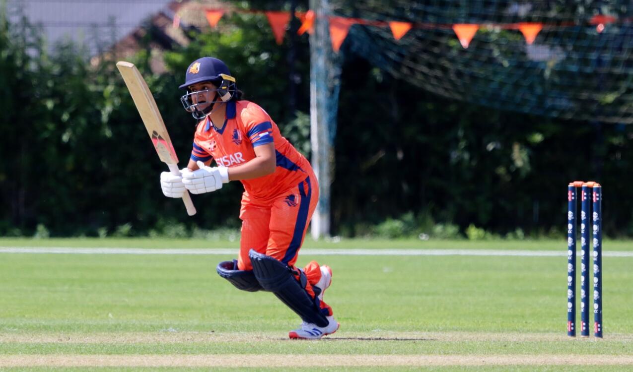 Phebe Molkenboer (12) played three beautiful drives, but fell victim to a beauty from American left arm seamer Tara Norris. Sterre Kalis opened her proverbial bank account with a well-timed pull shot and beautiful shots through and over the covers as the Netherlands raced to 33/1/4. In the following overs, the Netherlands remained on course for a win, but wickets started to fall, including from Kalis (20) (60/2/7.5) and top scorer Khurana (23). Those blows could not be overcome by the Netherlands.