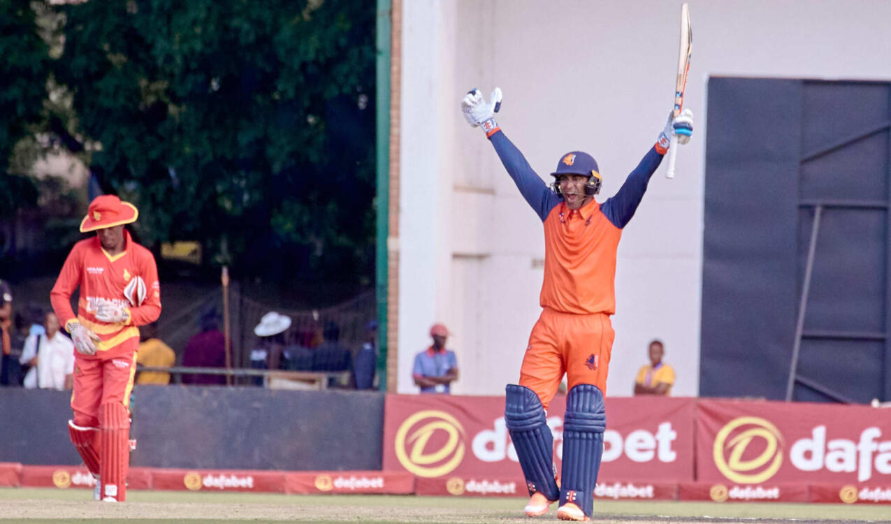 The Netherlands have won the first Dafabet ODI against Zimbabwe in Harare in spectacular fashion. At 98/7, the hosts were in trouble, but thanks to big partnerships late in the innings, they still managed 249 runs. With an score of 64/5 in the 21st over, the Netherlands seemed to have no chance. A brilliant century from Teja Nidamanuru, well backed by Shariz Ahmad and Paul van Meekeren, brought the unlikely turnaround: 255/7 on the penultimate ball.