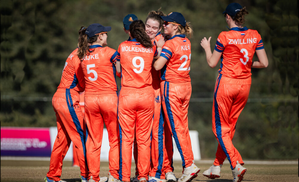 Ireland wasn’t presented the victory on a plate. Eva Lynch took the ‘prize wicket’ of Gaby Lewis (caught by Gwen Bloemen) and keeper Babette de Leede took no less than four catches.