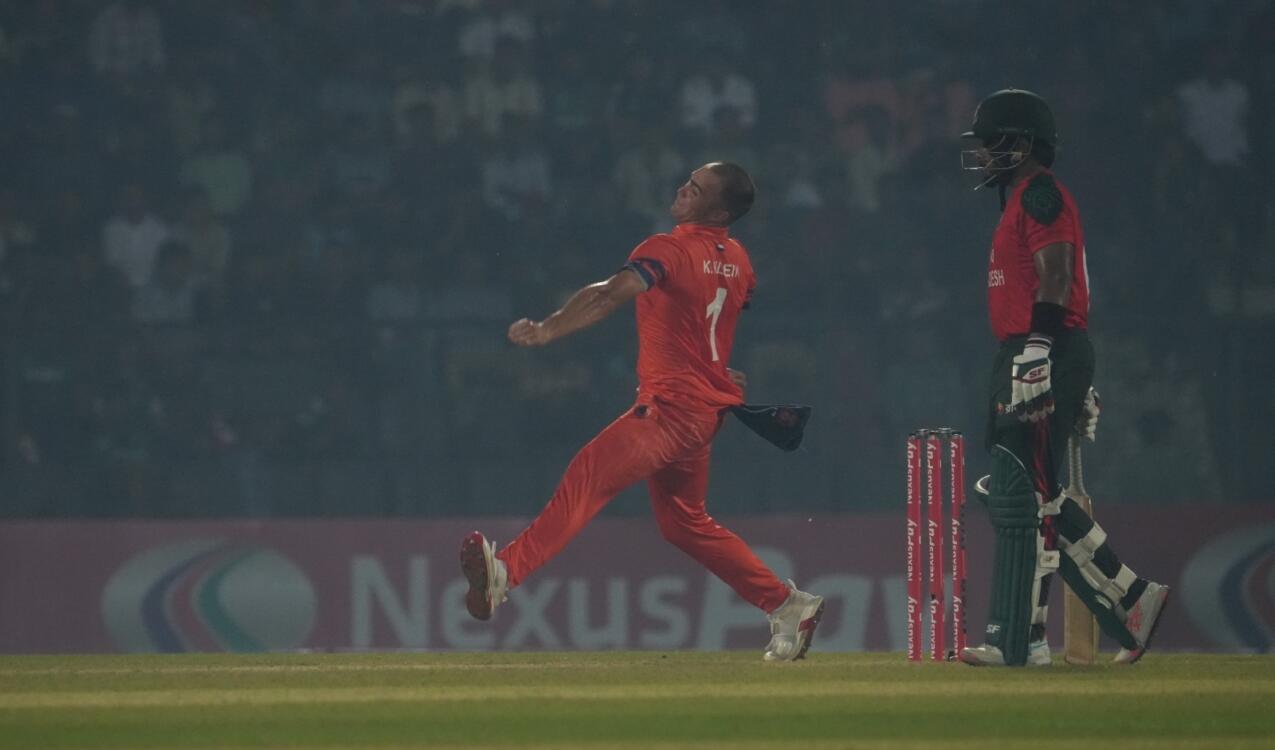 Pringle generated considerably more spin than his colleagues. Dutt was unlucky when another catching opportunity was dropped off his bowling in his third over. Kyle Klein was spared the same fate; he saw Litton Das (73) caught by Max O’Dowd (121/3) and two balls later Shamim (21) by Edwards after a vicious bouncer. Aryan Dutt looked set to give Kyle Klein his fourth wicket with a brilliant catch on the boundary, but his size 48 just touch the rope.
