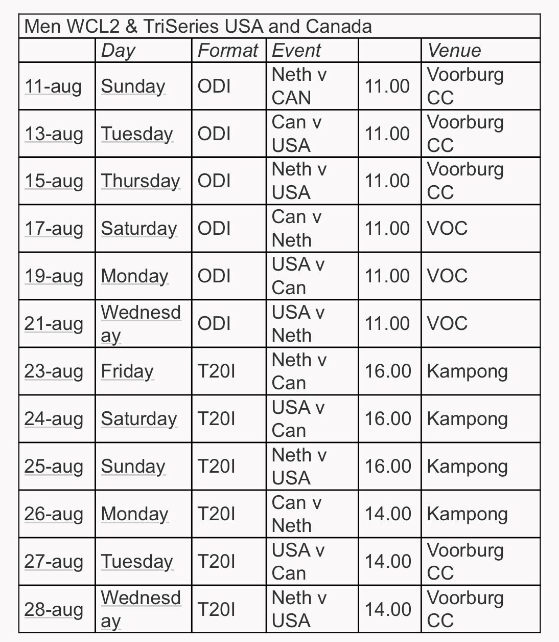As part of the ICC World Cricket League 2, the United States and Canada will visit the Netherlands in August. In addition to a number of One Day Internationals a number of T20Is will be played. The squad will be communicated shortly. Fixtures:
