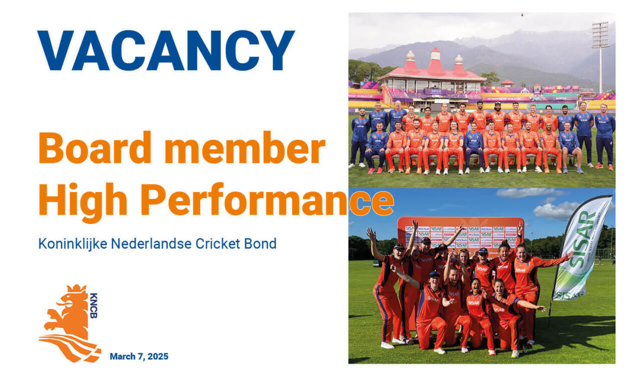 Would you like to contribute the further development of cricket in the Netherlands? Do you have a passion for top sport and high-performance programs? The Royal Dutch Cricket Association (KNCB) is looking for a board member with expertise in High Performance to further expand and further develop the vision and strategy for our national teams and talent development to realize our ambitions.