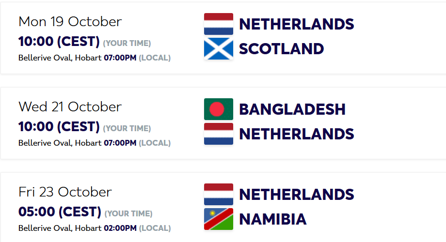 Nederland begint het WK met drie wedstrijden in Hobart, Tasmania, waar het in Groep B tegen Bangladesh, Namibië en Schotland speelt. Groep A bestaat uit Sri Lanka, PNG, Ierland en Oman. De nrs 1 en 2 van beide groepen plaatsen zich vervolgens voor de Super 12s. Voor het complete speelschema zie www.t20worldcup.com.