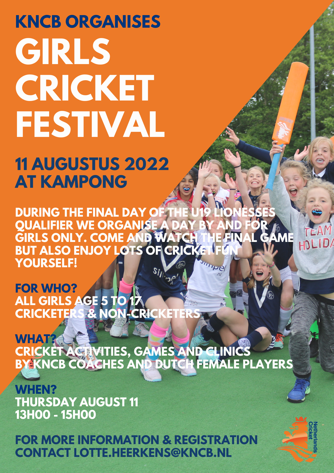 Op 11 augustus, de laatste dag van de kwalificatie, organiseren we van 13h00 tot 15h00 een dag speciaal door en voor meisjes en vrouwen. Alle meisjes van 5 tot 17 zijn welkom. Cricketers en niet cricketers. Op het tweede veld van Kampong zullen er challenges, wedstrijdjes, spelletjes en clinics worden georganiseerd. Deze activiteiten vinden plaats onder begeleiding van KNCB coaches en Nederlandse speelsters.