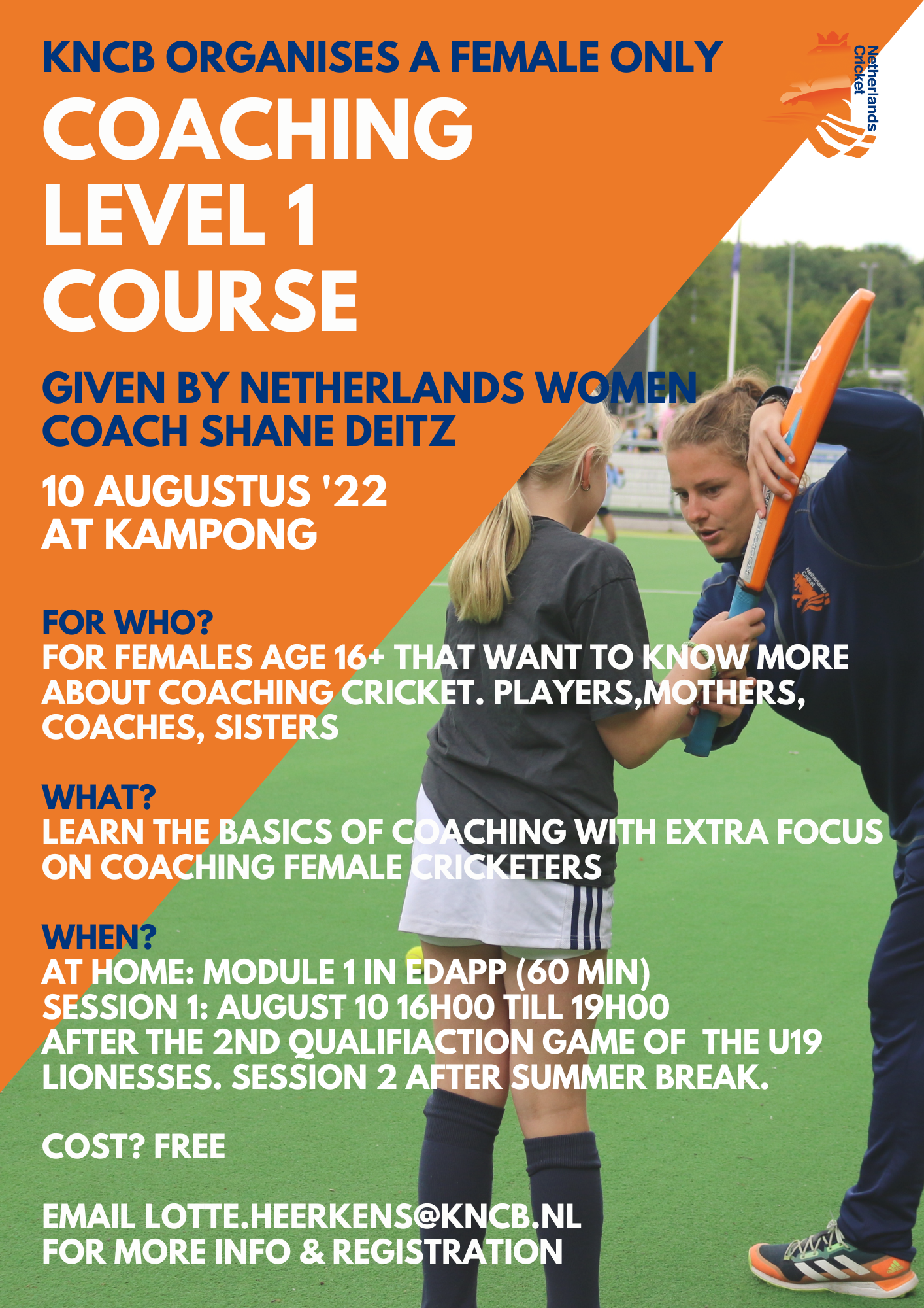 Daarnaast organiseren we een Female only level 1 Cricket Coaching Course op 10 Augustus van 16h00 tot 19h00. Deze cursus is voor alle meisjes/vrouwen van 16+ die meer willen leren over cricket coaching. Dit kunnen spelers zijn maar ook moeders, zussen, umpires, tantes etc. De cursus is gratis en zal gegeven worden door Shane Deitz.