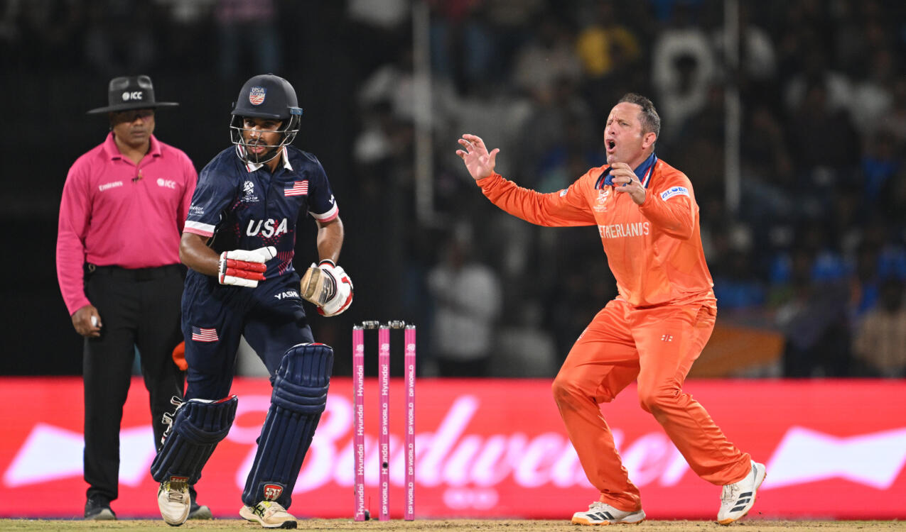 Fred Klaassen zorgde met een beauty voor 105/3/11. Mukkamalla bleef echter staan, batte prachtig en capituleerde pas na 79 runs (159/4/16.5). Ook de ‘death’ viel de kant op van de Amerikanen. De gevreesde 200-barrière werd echter niet geslecht: 196/6. Bas de Leede nam 3-37, Logan van Beek 1-28. Shubham Ranjane maakte 48 not out van 24 ballen.