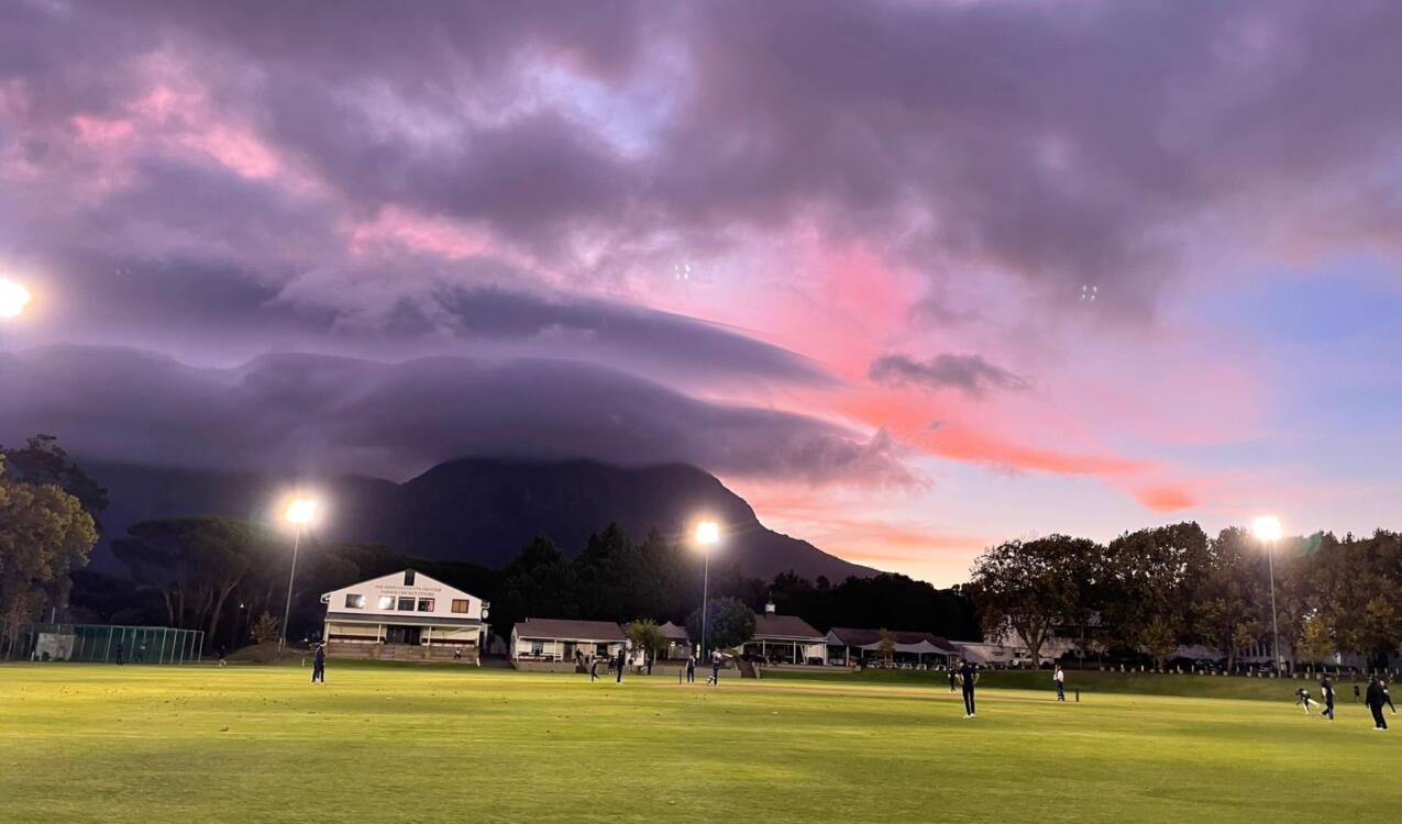 Het veld is mooi gelegen met de Tafelberg op de achtergrond; een prachtig plaatje. Niet afgeleid door dat al te bekende uitzicht, bouwden de openingsbatsmen van Bishop School een stabiel partnership van 130 runs op, totdat Teun Leijer een wicket nam. Pas 88 runs later viel het tweede wicket, dat van batsman nummer 1 die tegen die tijd 120 runs had gemakt. Bishop School sloot zijn innings af op 227 (Teun Leijer 1-37 in 7).