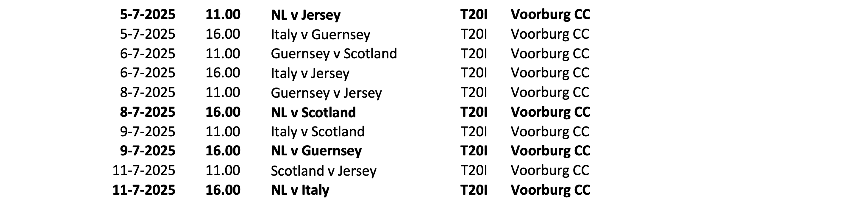 Van 18 november tot en met 1 december speelt ons vrouwenteam een toernooi voor Emerging Countries in Thailand. Het wedstrijdprogramma volgt zodra bekend. In januari spelen de Oranjevrouwen de T20 World Cup Qualifier in de Nepalese hoofdstad Kathmandu, die rond die tijd ook door ons mannenteam zal worden bezocht. In februari 2026 nemen de Oranjemannen deel aan de T20 World Cup, die in India en Sri Lanka zal worden gespeeld.