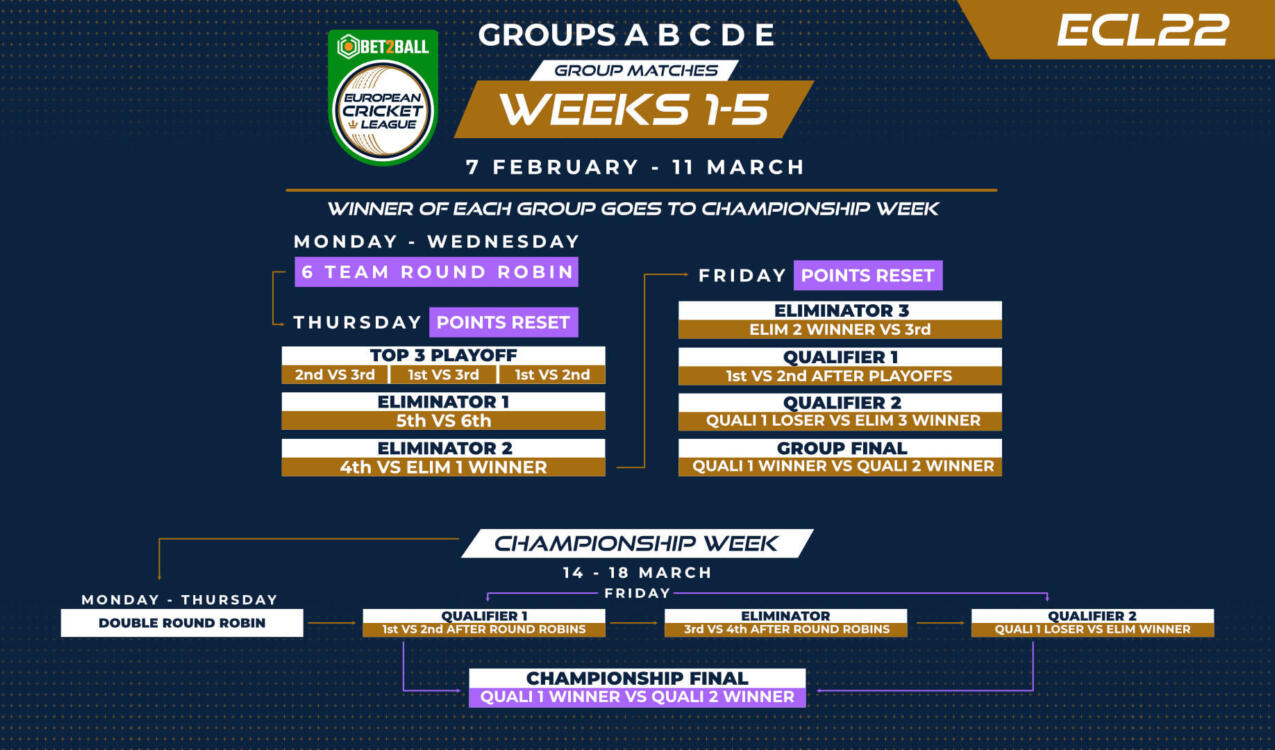 Alle wedstrijden worden gelivestreamd via https://www.ecn.cricket/european-cricket-league/scores-fixtures.