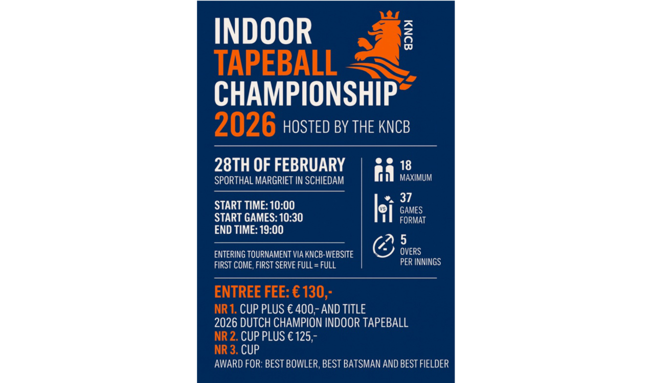Don't miss this unique opportunity to take part in the very first Dutch Indoor Tape-Ball Cricket Championship. Mark the date in your calendar, gather your team, and prepare for a day of excitement and sportsmanship.