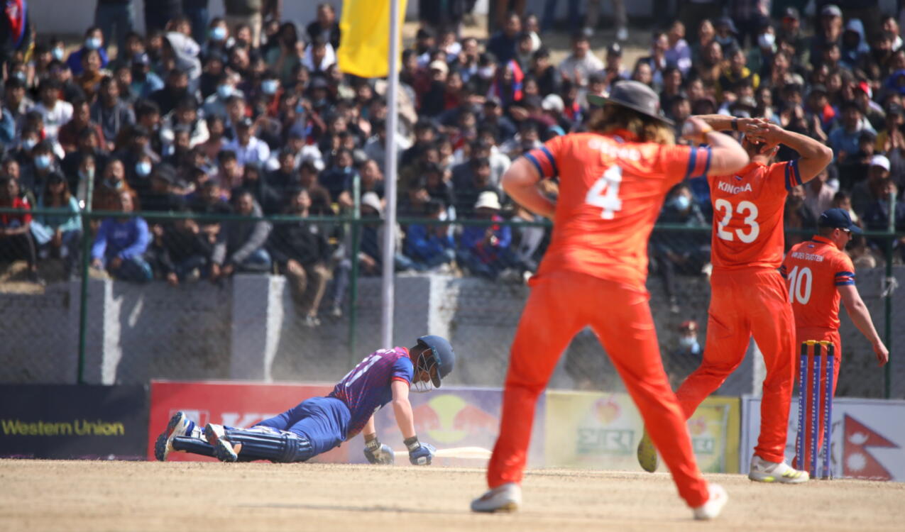 Zonder de bankzitters Fred Klaassen en Shariz Ahmad werden medium pacer Michael Levitt en offspinner Sybrand Engelbrecht (2-13) ingezet. De laatste met succes; een vang van Nidamanuru op backward point betekende 97/3 en met een vang van Edwards pakte Engelbrecht ook het wicket van tospcorer Poudel. Nepal was bij 120/4 allesbehalve kansloos, zeker na twee dure overs die Nepal op vijftien runs van de winst brachten.