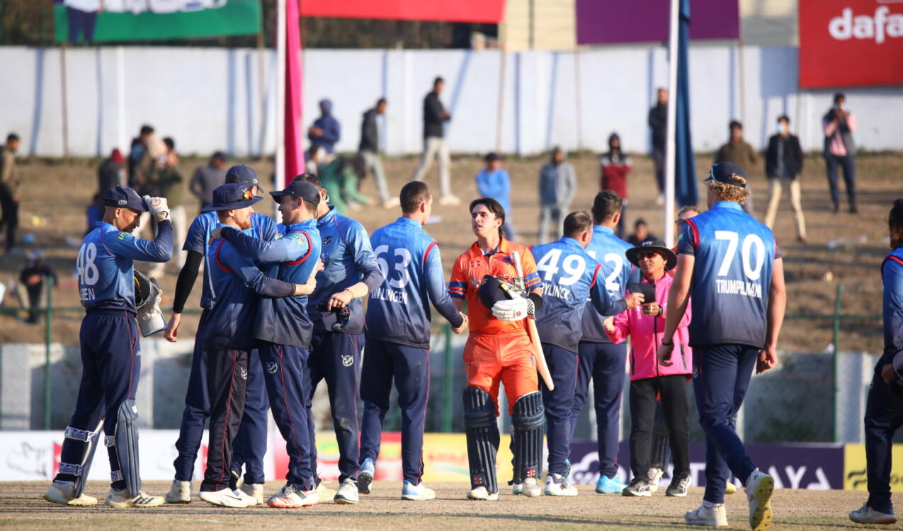 Noah Croes en Shariz Ahmad (19) brachten Nederland terug in de wedstrijd met een partnership van 54 voor het zevende wicket. Echter, vooral door gedisciplineerd spinbowlen en goed grondfielden liep de gevraagde runrate op naar acht runs per over. Ook vielen er steeds wickets op cruciale momenten.