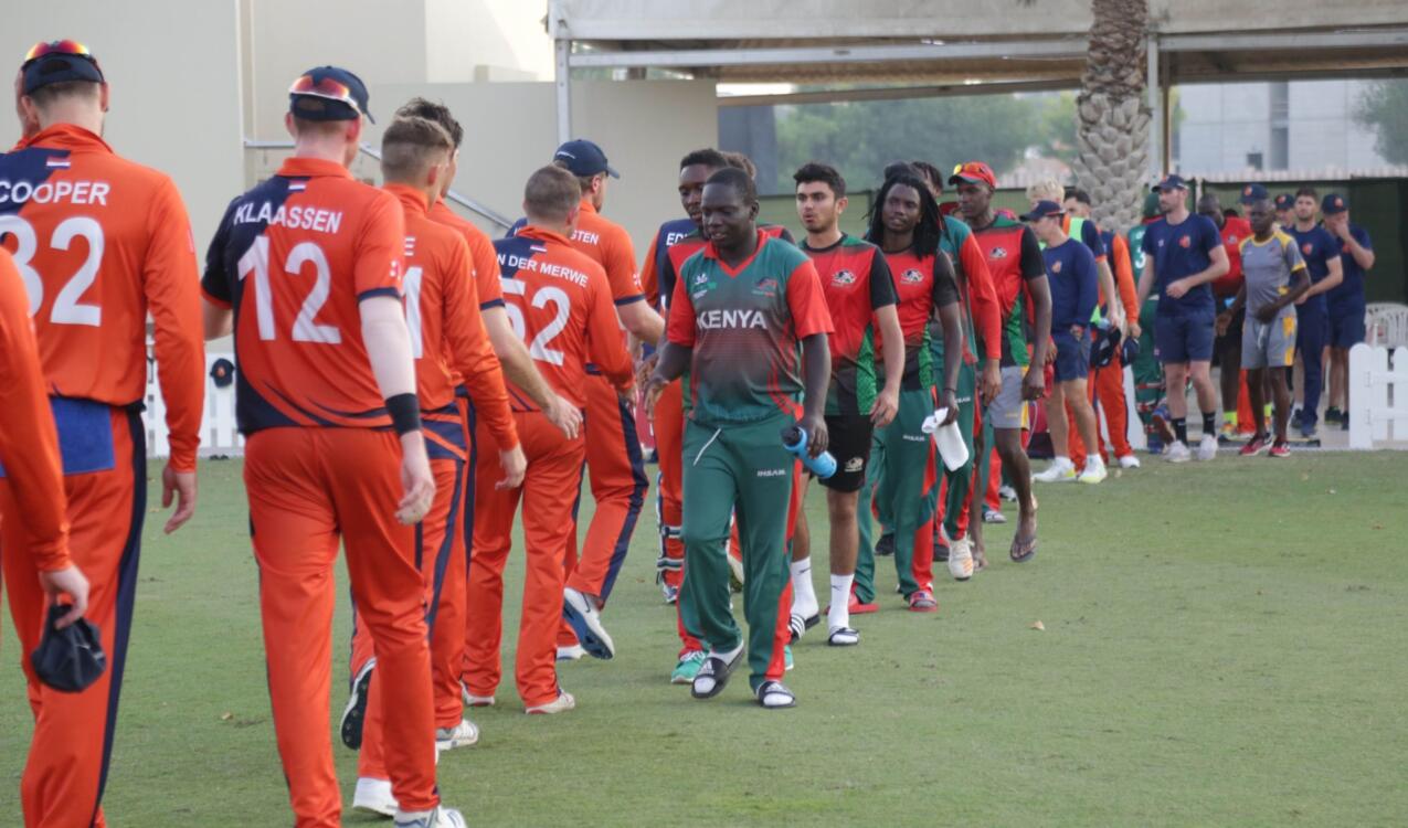 Een sterke all-round prestatie heeft Nederland de eerste winst opgeleverd in het T20 WK Kwalificatietoernooi. Het versloeg Kenia in de openingswedstrijd met 30 runs. De Oranje bowlers hadden 166 runs om te verdedigen en deden dit met verve. Nadat Roelof van der Merwe de innings opende met spin namen de pacers Fred Klaassen, Paul van Meekeren, Timm van der Gugten en Brandon Glover direct het initiatief. Zij beperkten Kenia tot slechts 48 runs in de eerste 10 overs waardoor het een zeer moeilijke opgave werd voor de Kenianen op de 166 runs te passeren. Batters Patel en Obuya gaven zich echter niet zomaar gewonnen en er moest een fantastische vang van Klaassen op eigen bowlen in de 17e over aan te passen komen om Obuya te verschalken. In dezelfde over pakte Klaassen nog een wicket en daarmee was de angel definitief uit de Keniaanse innings. In de laatste twee overs scoorde het nog slechts 8 runs waardoor de overwinning voor Nederland veilig was gesteld, Kenia 136/8.