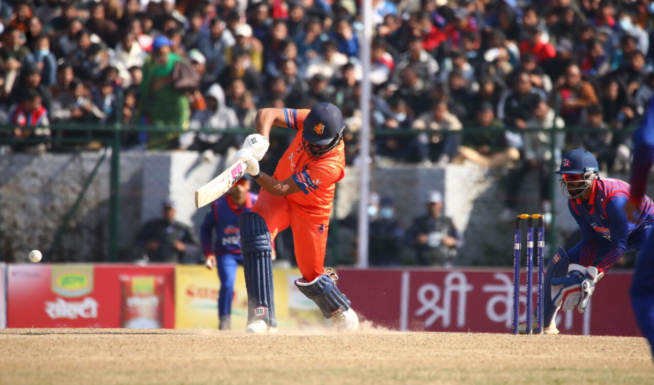 Omdat Nederland sterk bowlde en steeds wickets bleef nemen, kon Kushal Bhurtel (66) niet zijn gebruikelijke offensieve spel spelen. Hij speelde een goede innings, maar kreeg onvoldoende steun, waarbij Oranje overigens geluk had met de bizarre run out van Airee.