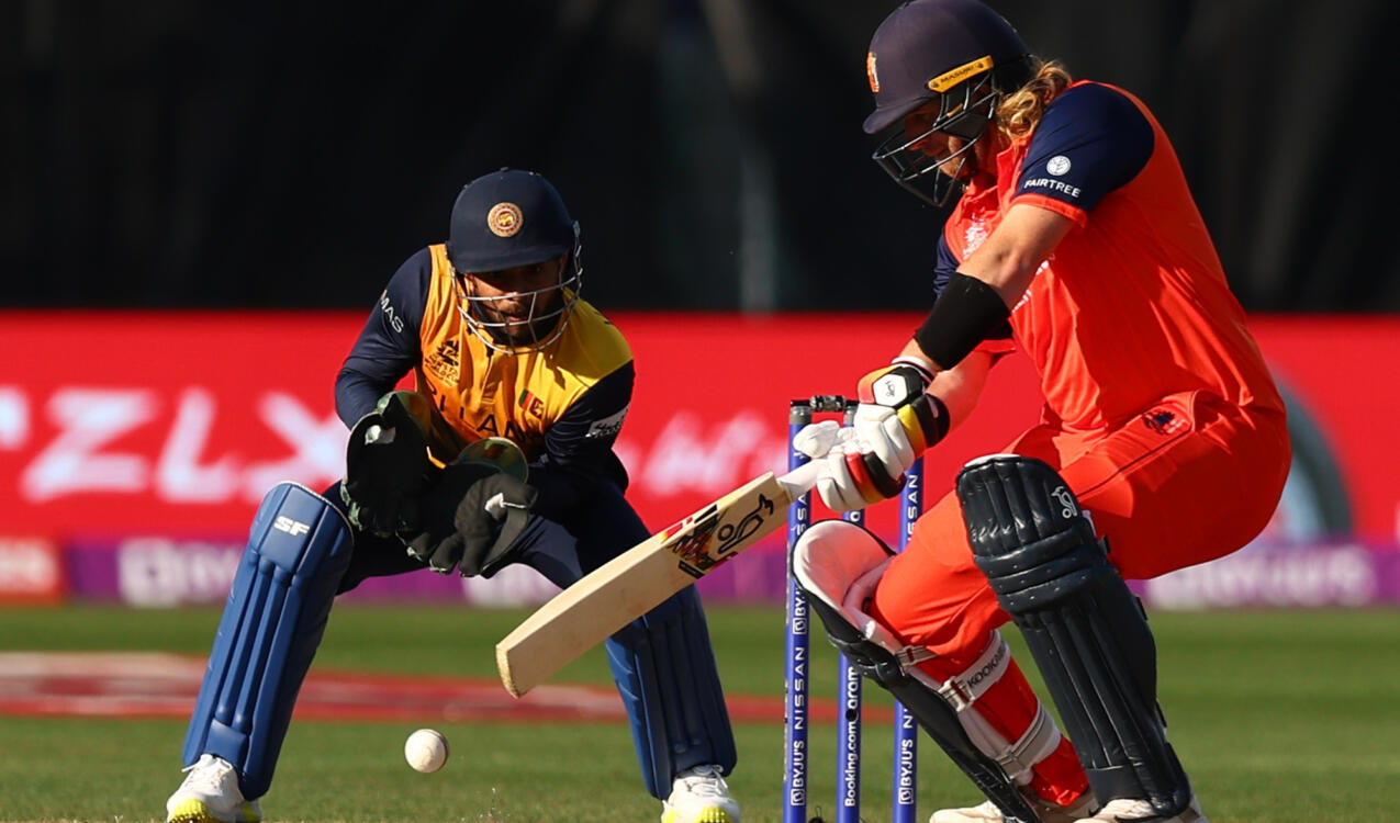 De wederom briljant bowlende Paul van Meekeren (2-25) had in zijn eerste over twee kansen om Pathum Nissanka’s wicket te nemen. Een top edge plofte net voor keeper Edwards in het gras. Een bal later kreeg de boomlange seamer een moeilijke caught and bowled-kans die zelfs nog tot de (cruciale) run out van Mendis had kunnen leiden.