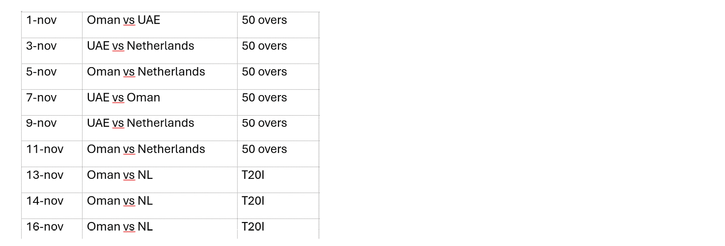 In Oman neemt Nederland het twee keer op tegen de Verenigde Arabische Emiraten (op 3 en 9 november) en tweemaal tegen het gastland (op 5 en 11 november). Deze wedstrijden maken deel uit van de ICC Men’s Cricket World Cup League 2. De beste vier landen van deze competitie mogen in 2027 deelnemen aan een mondiaal WK-kwalificatietoernooi met tien deelnemers.