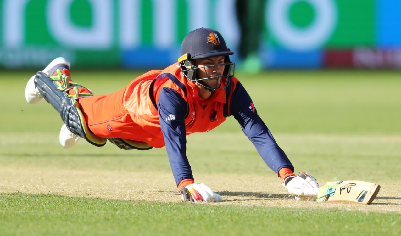 Dat die keuze niet goed uitpakte, kwam omdat Pakistan optimaal gebruik maakte van de ‘bouncy track’. Een weergaloze cover drive van Myburgh (6) werd gevolgd door een top edge die zijn einde betekende: 7/1. Het was onmogelijk om te pullen. Bas de Leede (6 rh) was laat op een pull shot; de grille van zijn helm raakte zijn jukbeen. Hij ging retired hurt en werd in het stadion gehecht. Tegenwoordig mag de subsitute (Logan van Beek) dan de plaats van de geblesseerde innemen en naast fielden ook batten en bowlen. Met Tom Cooper uit, De Leede retired hurt en O’Dowd lbw stond Nederland op een vrij uitzichtloze 34/3 na tien overs.