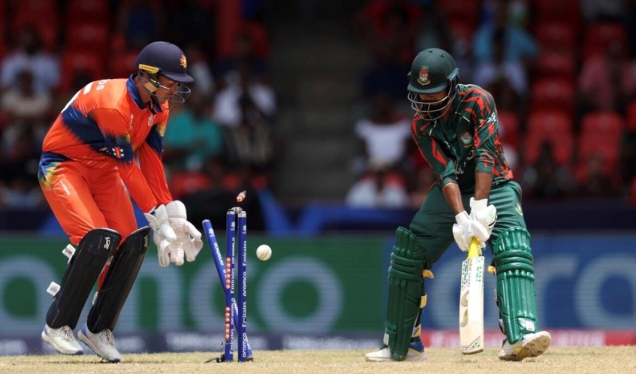 Bangladesh liep vlot uit naar 66/2/7. Bas de Leede hielp Van Meekeren (2-15) aan diens eerste wicket met een vang in het outfield (71/3, Tanzid 35). Toen Tim Pringle in de aanval werd betrokken, werd het 89/4 (Hridoy). De val van het vierde wicket bracht echter de twee meest ervaren Bengalen op de pitch: de 37-jarige Shakib (64 not out uit 46 ballen) en de 38-jarige Mahmudullah (25). Zij maakten een vlot partnership van 41 runs voor het vijfde wicket. Bangladesh sloot de innings af op 159/5.