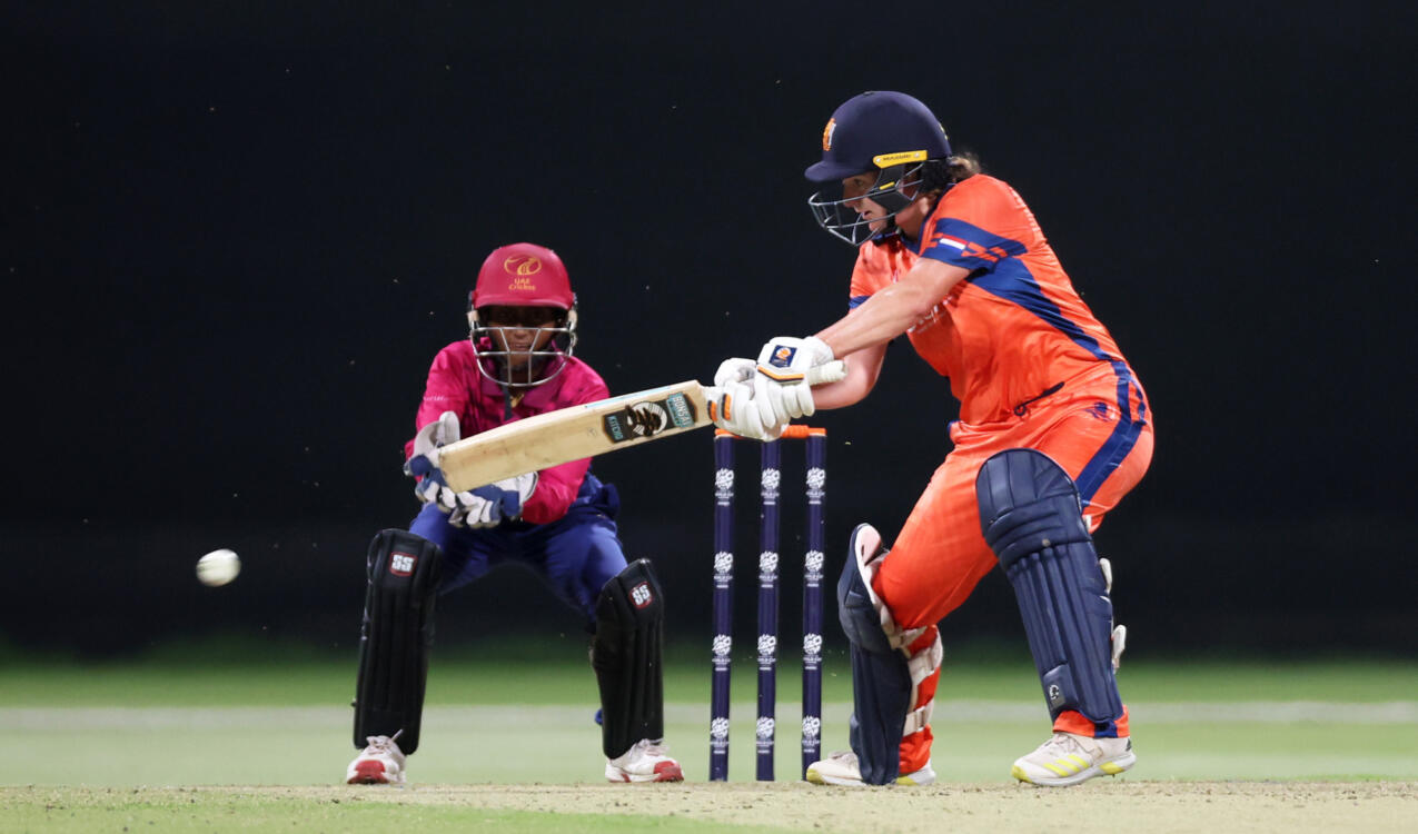 Het begin was desastreus voor Nederland. Topbat Sterre Kalis ging op haar eerste bal LBW en kort daarna werd Babette de Leede ‘through the gate’ gebowled door een inswinger van de 17-jarige Dharnidharka (10/2).