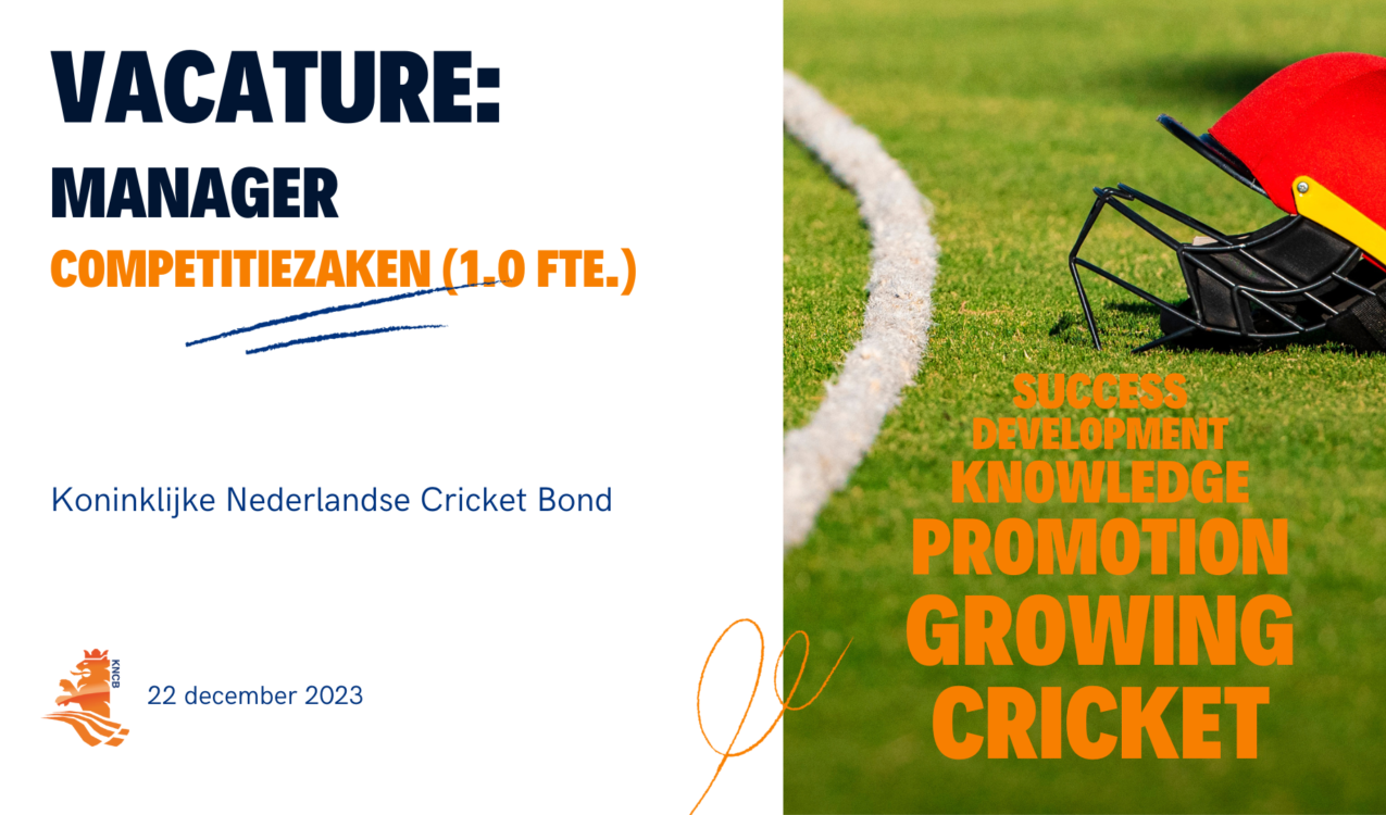 De Koninklijke Nederlandse Cricket Bond (KNCB) is verantwoordelijk voor de organisatie en ontwikkeling van de cricketsport in Nederland. De KNCB is lid van NOC*NSF en de International Cricket Council (ICC). Cricket is mondiaal de op één na grootste sport ter wereld en vanaf 2028 Olympisch. Onze nationale teams (m/v) behoren tot de top 15 van de wereld en het succes van onze topteams willen we ook in eigen land benutten om te groeien naar 40% van actieve cricketers. We hebben binnen deze doelstelling een sterke focus op vrouwen- en jeugddeelname.