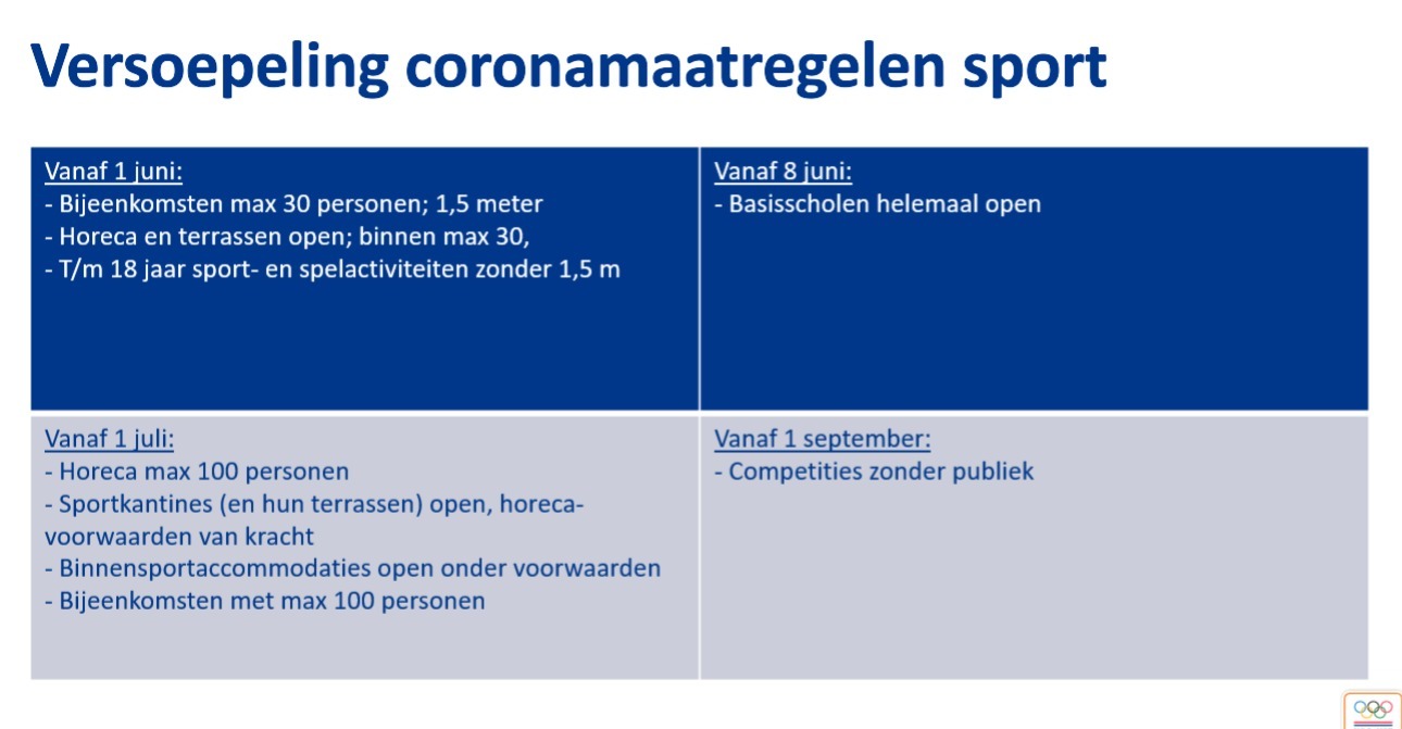 Als de ontwikkelingen dat toelaten, volgen er per 1 juli nieuwe versoepelingen. Aan dat pakket zijn door het kabinet enkele categorieën toegevoegd. Het gaat om sportscholen en fitnessclubs, sauna’s en wellness, sport- en verenigingskantines en casino’s en speelhallen. Eerder gold 1 september als beoogde openingsdatum. Uiteraard gelden daarbij basisregels en aanvullende maatregelen. Definitieve besluitvorming hierover volgt eind juni, waarbij ook naar de positie van overige binnensporten wordt gekeken.