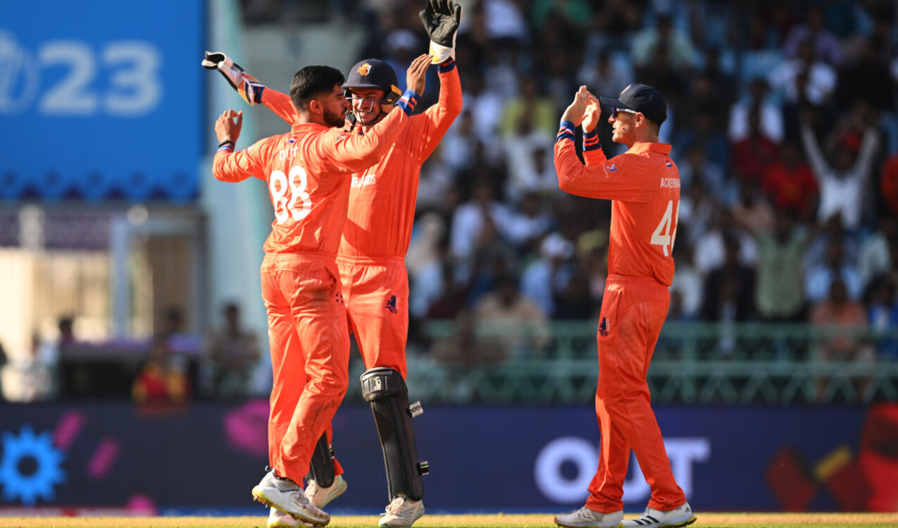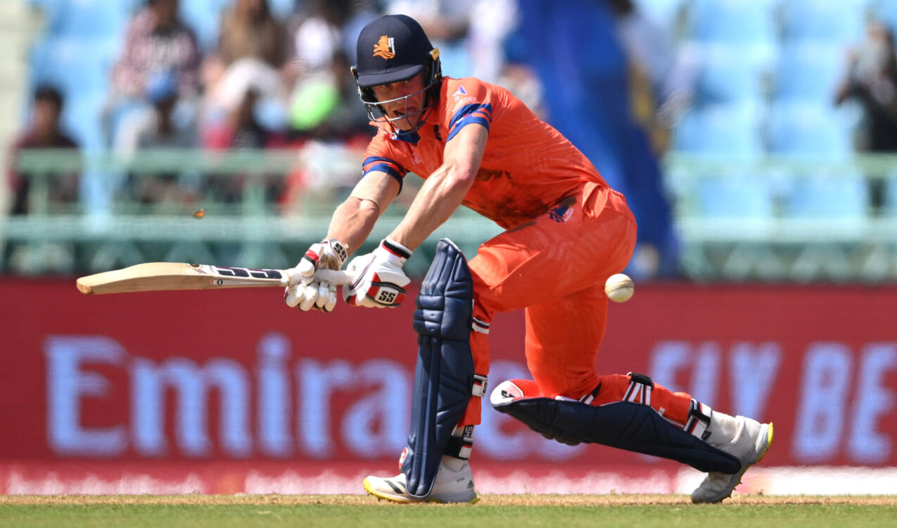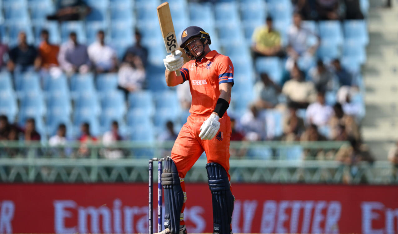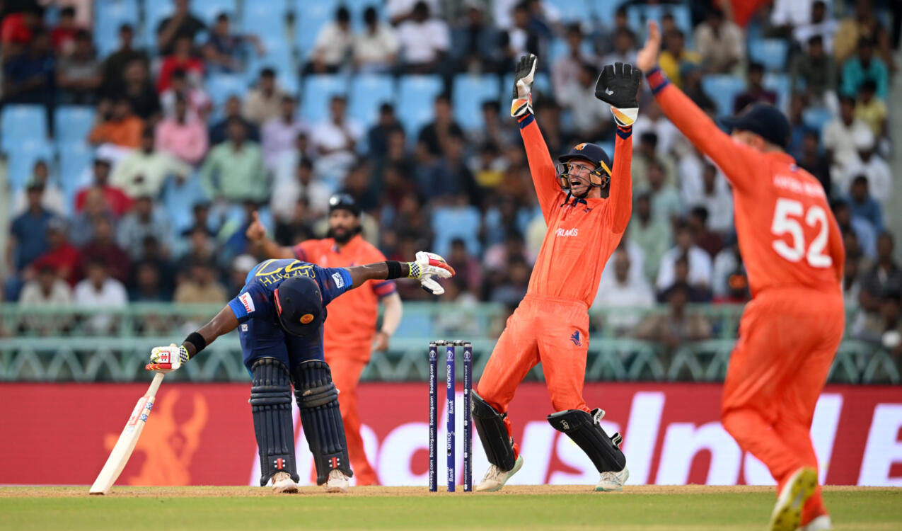 “What a World Cup Aryan Dutt’s having!”, aldus het commentaar. De aanleiding: Kusal Perera sneuvelde in de vijfde over, gevolgd door Kusal Mendis die een top edge naar Van Meekeren lobde (52/2). Een moeilijke gemiste stumpingkans had de ‘odds’ zelfs kunnen veranderen.